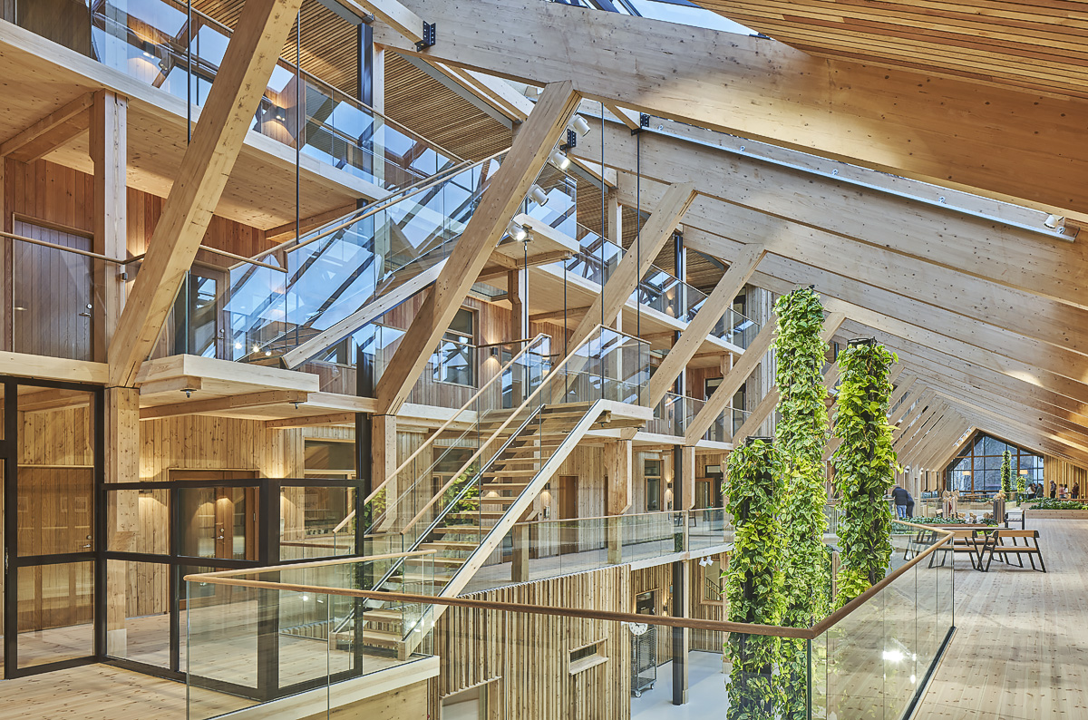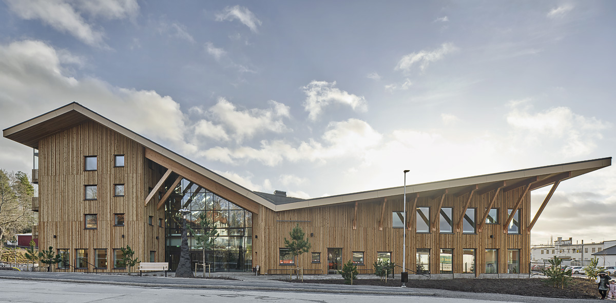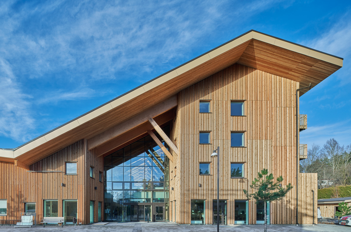 Huset är naturorienterat tack vare det den omgivande naturen. En konsekvent gestaltning med association till naturen genomsyrar där nordiska träslag och naturbetong i stommen karaktäriserar interiören medan en kostym av lärkribbpanel bildar fasad. Det kraftfulla taket illustrerar marken som tas bort och istället flyttas upp på taket och håller samman till en helhet.