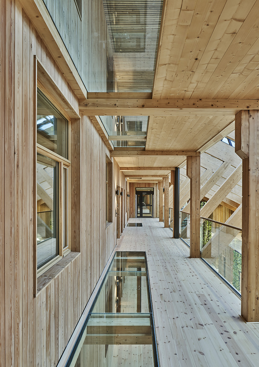 De två anläggningarna, bostadshuset och vårdcentralen, är separerade till två byggnader och även fastigheter men sammanlänkade genom den gemensamma glasgallerian, Sinnenas galleria, och det gröna taket. Det höga atriet i Sinnenas galleria med sitt glastak är hjärtat i Lindesbergs nya hälsocentrum. Glasgallerian fungerar här som ett vardagsrum för alla boende och besökande, eller om man vill en parkmiljö inomhus där ljuset flödar in. Från gallerian ansluter två trapphus som med tre loftgångar leder till lägenheterna. Hit leds indirekt ljus från gallerian med hjälp av glastak, glasgavlar, glasräcken och till och med glasgolv innerst i loftgångsbjälklagen vilket ger ett fint ljusflöde och även utsikt upp mot himlen från alla bostäder.